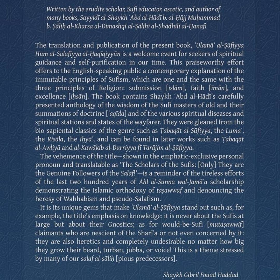The translation and publication of the present book, ʿUlamaʾ al-Sufiyya Hum al-Salafiyya al-Haqiqiyyun is a welcome event for seekers of spiritual guidance and self-purification in our time.
