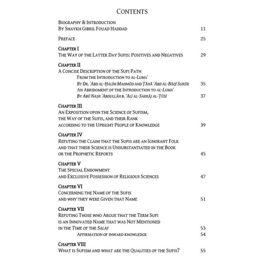 The book contains Shaykh ʿAbd al-Hadi’s carefully presented anthology of the wisdom of the Sufi masters of old and their summations of doctrine [ʿaqida] and of the various spiritual diseases and spiritual stations and states of the wayfarer. They were gleaned from the bio-sapiental classics of the genre such as Tabaqat al-Sufiyya, the Lumaʿ, the Risala, the Ihyaʾ, and can be found in later works such as Tabaqat al-Awliya and al-Kawakib al-Durriyya fi Tarajim al-Sufiyya.